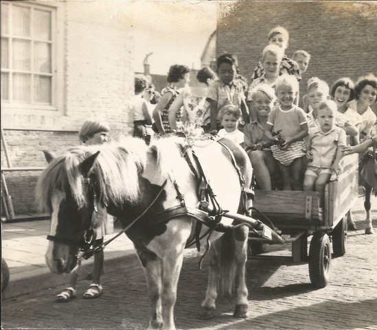 Een pony vóór de kar wacht geduldig tot hij zijn vrachtje met jeugdig Vlissings ongeregeld mag gaan trekken. Wibo is herkenbaar aan zijn schattige pofbroekje met streepjes, links achter hem zit zijn grote broer Wim.
