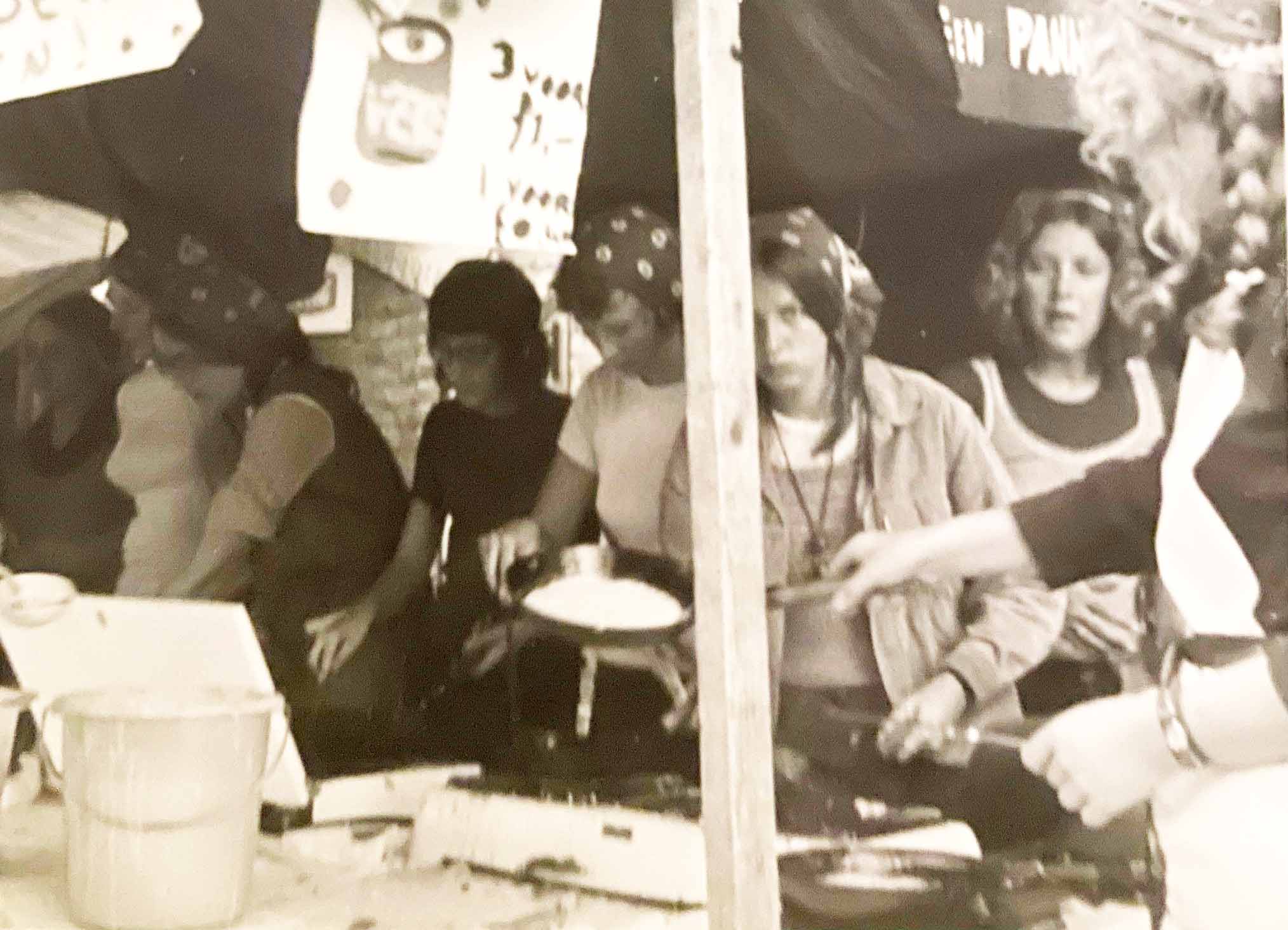 Een paar vaders komen helpen om de gasflessen aan te sluiten en ondertussen maken wij al emmers vol beslag. Om een uur of negen glijden de eerste pannenkoeken (toen nog pannekoeken) al uit de pan. We hoeven ze niet te stapelen; het publiek wil ze zo uit de pan opeten en het geld rinkelt al snel in de spaarpotjes. Veertig cent per stuk en drie voor een gulden. We lossen elkaar geregeld af zodat je ook eens even naar de wc (in Seventy Seven) kan en even tijd hebt voor een shagje.