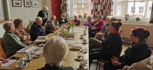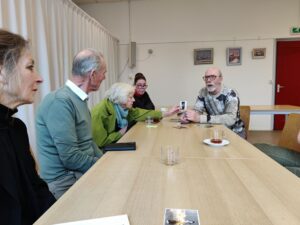 De puzzelwinnaars, Ad de Priester (rechts) en Jacqueline Midavaine (derde van links) praten even na, en bekijken onderwijl foto’s. | foto Margreeth Ernens