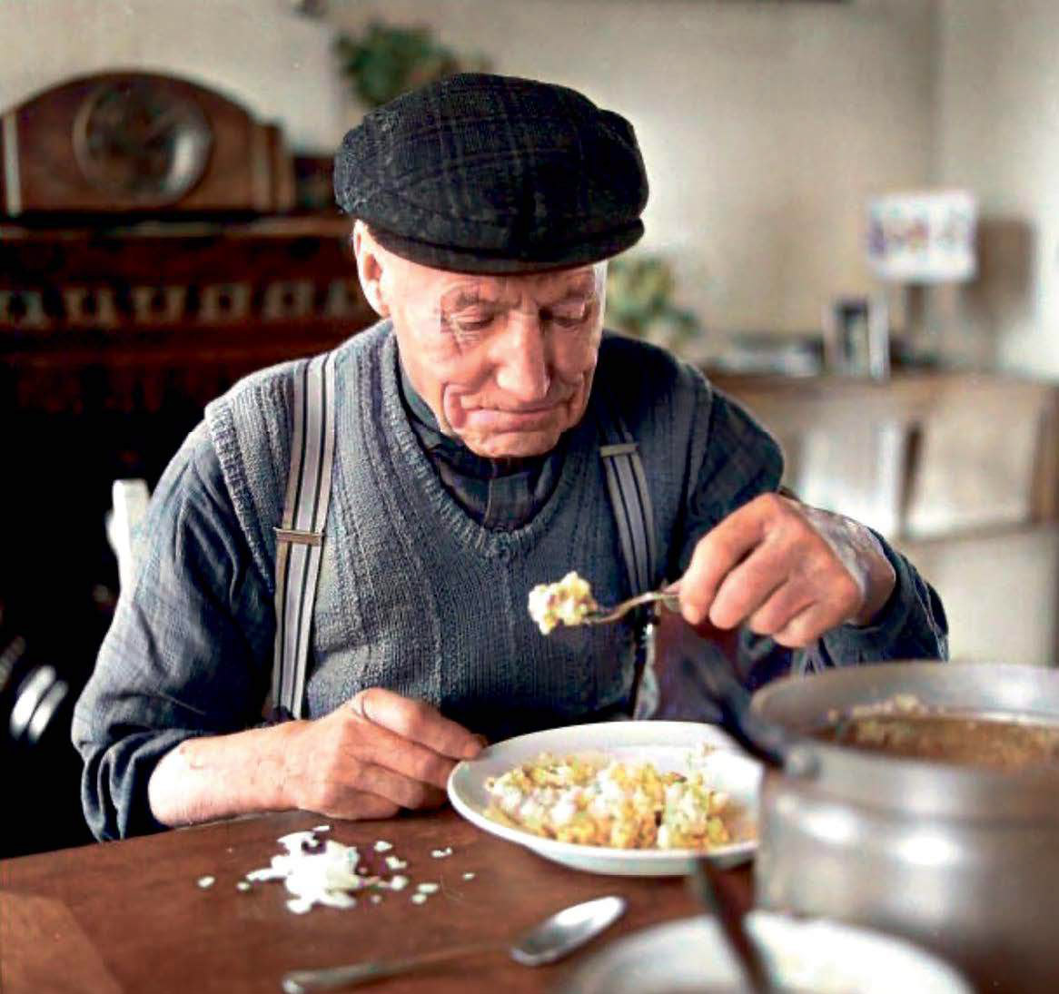 foto: Een eenvoudige, doch voedzame maaltijd. | Foto: Adri van Wyngen/ZB/Beeldbank Zeeland: rec.nr. 76445. Ingekleurd met AI