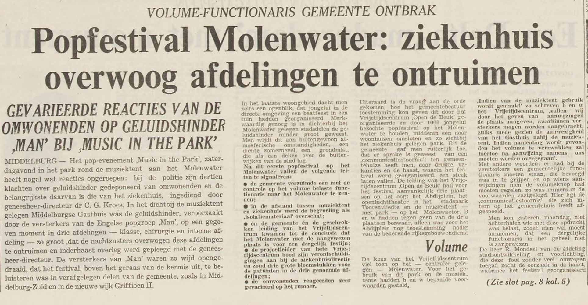 Ja, het volume dat die band produceerde was enorm. De PZC schreef dat de rockmuziek van Man het rumoer had overstemd van de kermis op de Markt die op dat moment ook in volle gang was. Ik als jonge, popminnende toehoorder vond dat muzikale ‘kabaal’ natuurlijk heel opwindend. Maar enkele afdelingen in het nabijgelegen ziekenhuis ’t Gasthuis hadden er zo veel last van dat ze hebben overwogen om hun patiënten tijdelijk naar een rustiger deel van het hospitaal te verplaatsen.