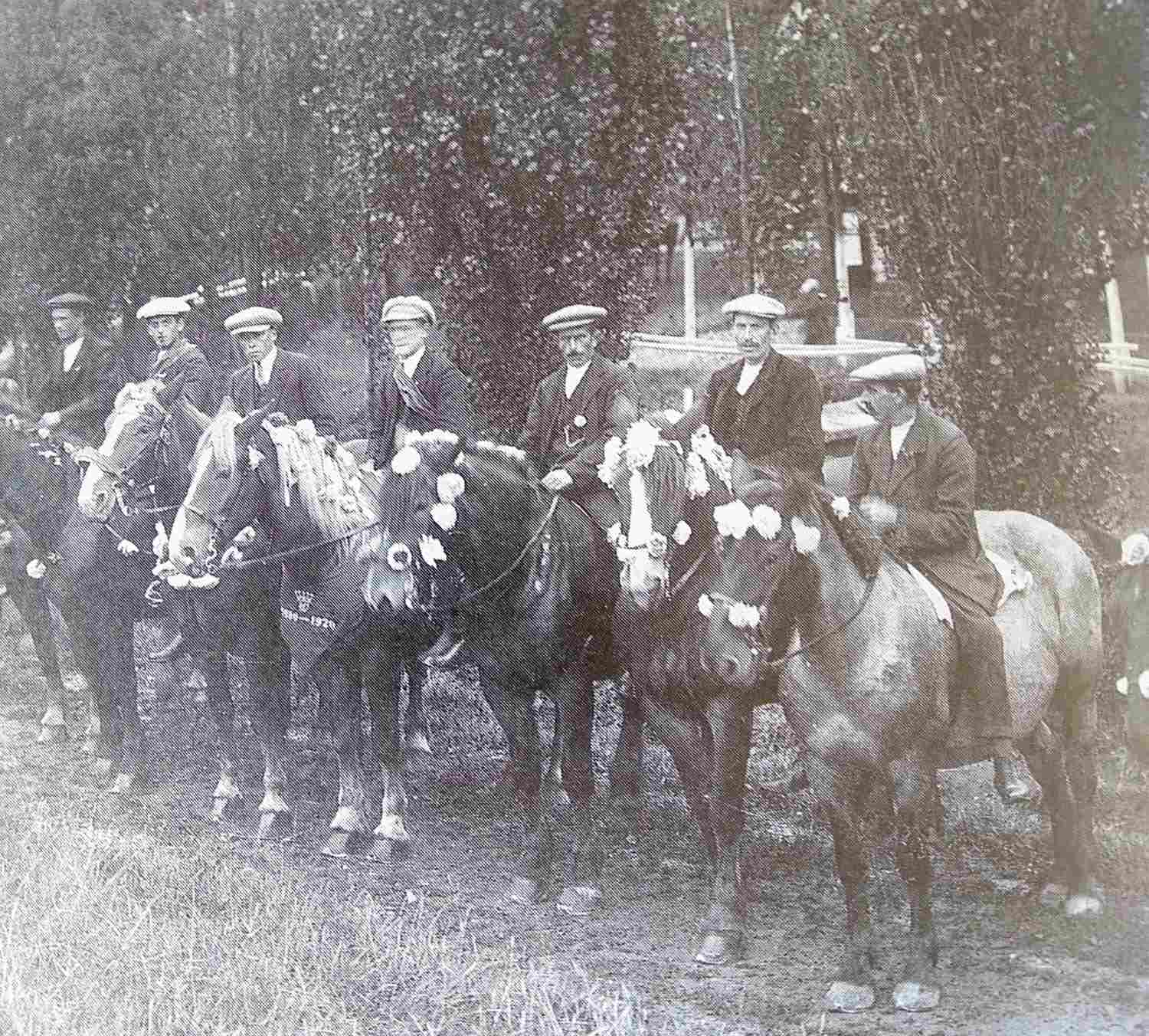 foto: Katse paardenknechten op versierde paarden staan opgesteld bij de Boomdijk in de Leendert Abrahampolder. Hendrik (Eine) Adriaanse is de tweede van rechts.